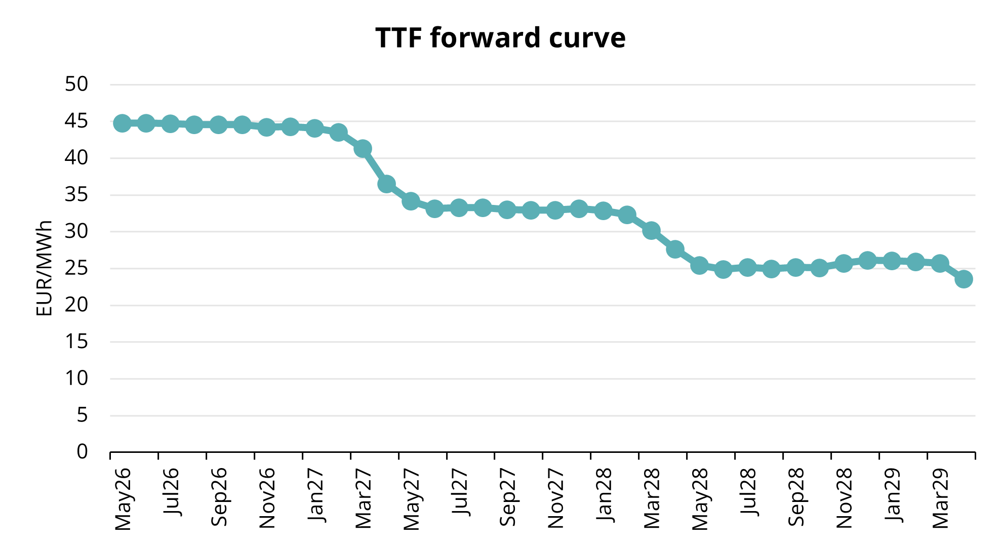 Kaasuvarastojen täyttöä vaikeuttaa lisäksi markkinarakenne. Termiinikäyrä on takapainoinen eli kesäsopimukset ovat talvisopimuksia kalliimpia. Tämä heikentää varastojen täyttämisen kaupallista kannattavuutta, koska markkina ei tarjoa tavanomaista taloudellista kannustinta ostaa kaasua kesällä ja varastoida sitä talvea varten.